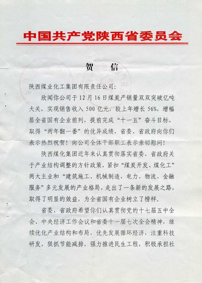 日前,陜西煤業(yè)化工集團(tuán)公司收到了來自中共陜西省委、陜西省人民政府的賀信,祝賀集團(tuán)公司12月16日煤炭產(chǎn)銷量雙雙突破億噸大關(guān),實現(xiàn)銷售收入500億元,較上年增長56%,增幅居全省國有企業(yè)前列,提前完成“十一五”奮斗目標(biāo),取得“兩年翻一番”的優(yōu)異成績。