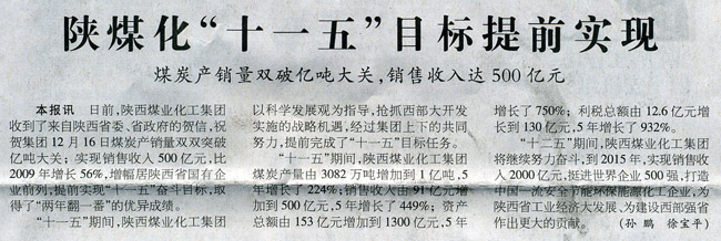 中國(guó)煤炭報(bào)一版:陜煤化“十一五”目標(biāo)提前實(shí)現(xiàn)