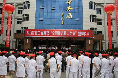 8月25日上午,銅川礦業(yè)公司機(jī)關(guān)辦公大院,鑼鼓喧天,軍樂(lè)陣陣,鞭炮齊鳴,彩虹門、紅地毯和數(shù)條巨幅標(biāo)語(yǔ)相映成輝。上午10時(shí)許,銅川礦區(qū)工會(huì)榮獲“全國(guó)模范職工之家”榮譽(yù)稱號(hào)授牌儀式在這里隆重舉行。