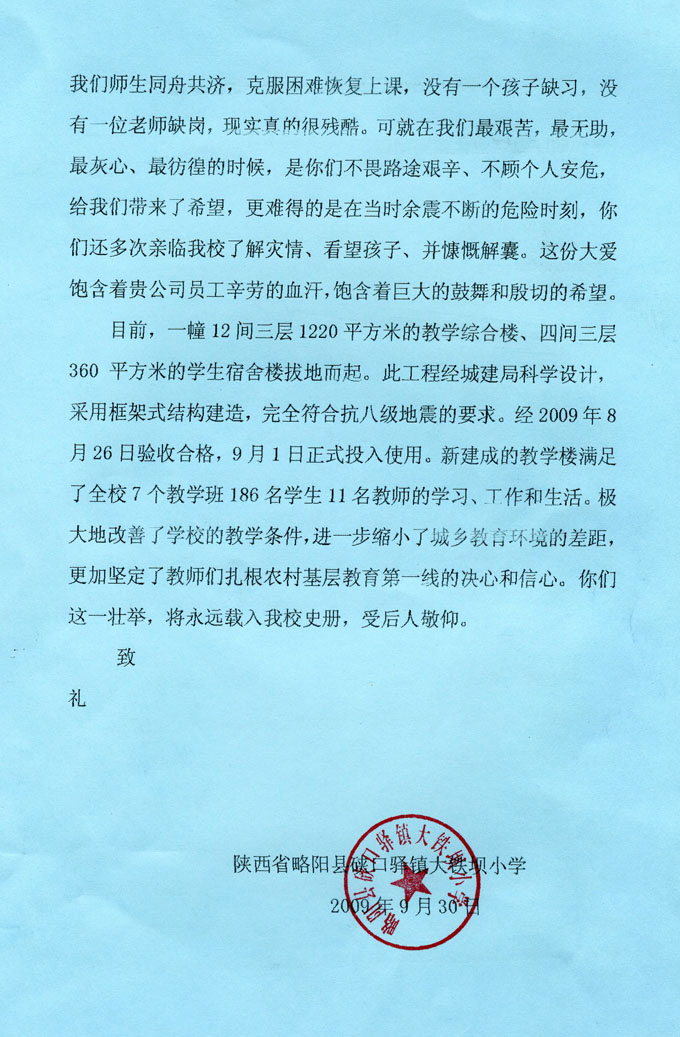 感謝信中寫到,去年5?12四川汶川特大地震中,大鐵壩小學(xué)一幢8間240平方米的教學(xué)樓變得搖搖欲墜,11間220平方米的師生宿舍及辦公用房四處破裂。災(zāi)后,學(xué)校搭建帳篷自立自救,爭取活動板房搭建教室,開始頂風(fēng)雨、冒嚴(yán)寒,師生同舟共濟(jì),克服困難恢復(fù)上課。就在這時(shí),陜西煤業(yè)化工集團(tuán)公司黨委書記、董事長華煒一行在余震不斷的情況下,不畏路途艱辛、不顧個(gè)人安危,親臨學(xué)校了解災(zāi)情、看望孩子、并慷慨解囊,援助該校重建。目前,一幢12間三層1220平方米的教學(xué)綜合樓、四間三層360平方米的學(xué)生宿舍樓拔地而起。此工程經(jīng)城建局科學(xué)設(shè)計(jì),采用框架式結(jié)構(gòu)建造,完全符合抗八級地震的要求。經(jīng)2009年8月26日驗(yàn)收合格,9月1日正式投入使用。新建成的教學(xué)樓滿足了全校7個(gè)教學(xué)班186名學(xué)生11名教師的學(xué)習(xí)、工作和生活。極大地改善了學(xué)校的教學(xué)條件,進(jìn)一步縮小了城鄉(xiāng)教育環(huán)境的差距,更加堅(jiān)定了教師們扎根農(nóng)村基層教育第一線的決心和信心。感謝信最后,飽含感恩之心寫到:“你們這一壯舉,將永遠(yuǎn)載入我校史冊,受后人敬仰。”