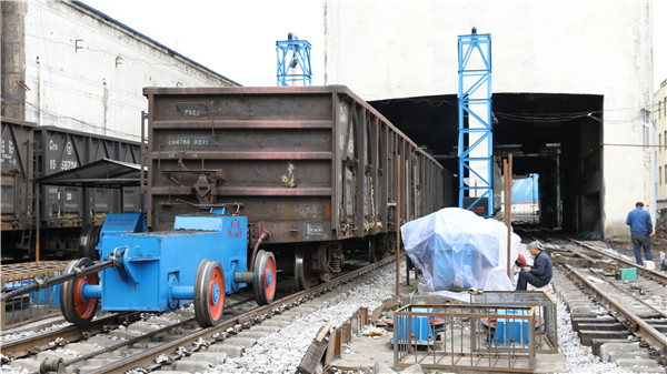 10月2日,氣溫13度。鐵路裝車系統(tǒng)升級改造施工現(xiàn)場,電焊火花四濺。新“鐵?!北寂茉谲壍谰€上,牽引調度絞車已投入使用。