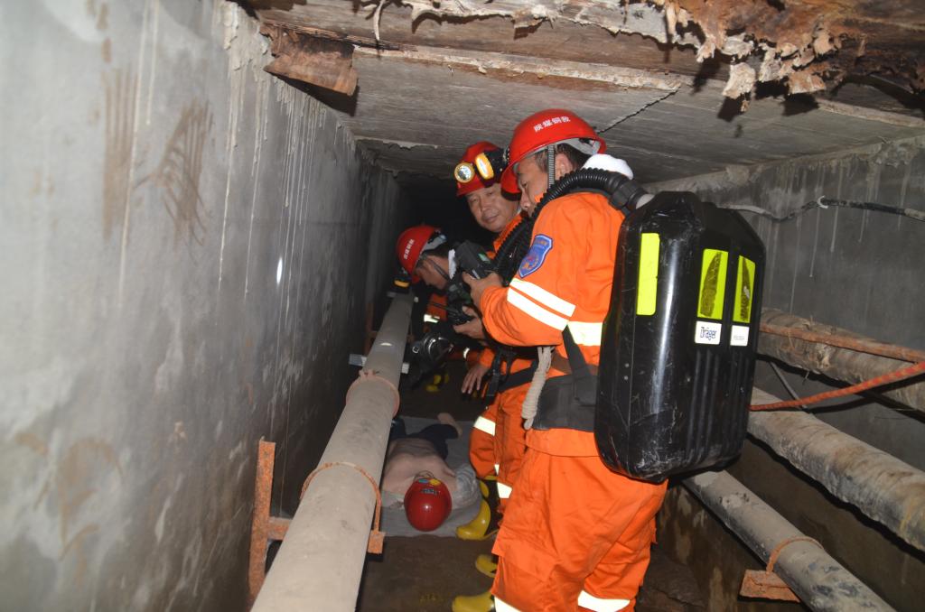 這是9月15日上午,公司礦山救護大隊開展有限空間作業(yè)事故救援實戰(zhàn)演練的畫面。 演練以某污水處理廠組織工人實施地下綜合管溝清淤作業(yè),未嚴(yán)格落實安全技術(shù)措施,因管道溝內(nèi)氧氣濃度不足,造成1名工人在進入作業(yè)時缺氧窒息為背景,出動指戰(zhàn)員18人、救援車輛4臺、各類救援裝備30余臺套,設(shè)置有聞警出動、入井準(zhǔn)備、通風(fēng)供氧、氣體檢測、傷員救助、心肺復(fù)蘇等科目。演練地點設(shè)在礦山救護大隊園區(qū)地下綜合管溝。