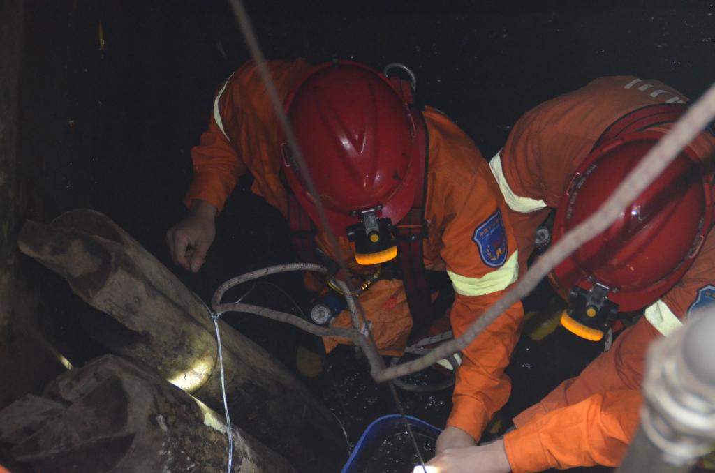 接到命令后,救護(hù)大隊(duì)立即組織人員趕往現(xiàn)場(chǎng)救援人員。警戒組拉線警戒,裝備保障組卸裝備、安裝三腳架,通風(fēng)組連接、調(diào)試通風(fēng)機(jī)進(jìn)行窒息區(qū)域的強(qiáng)制通風(fēng)作業(yè),排水組連接、安裝排水泵并對(duì)進(jìn)水區(qū)域進(jìn)行排水作業(yè),偵察組檢測(cè)氣體并探查倉內(nèi)水位,救援組清理倉底淤泥并救出遇難人員。