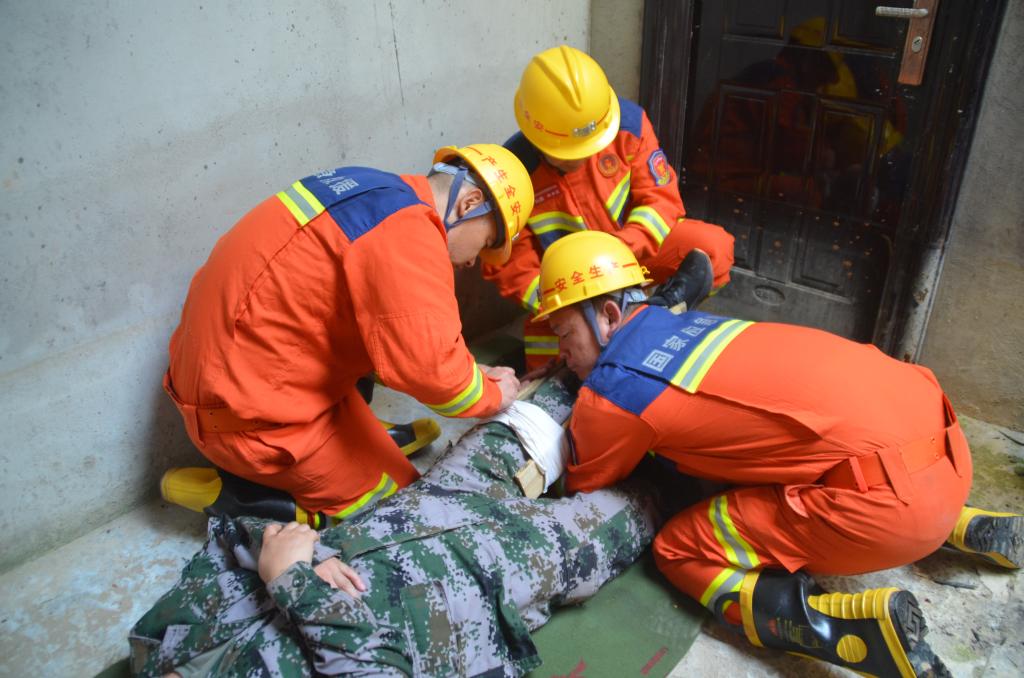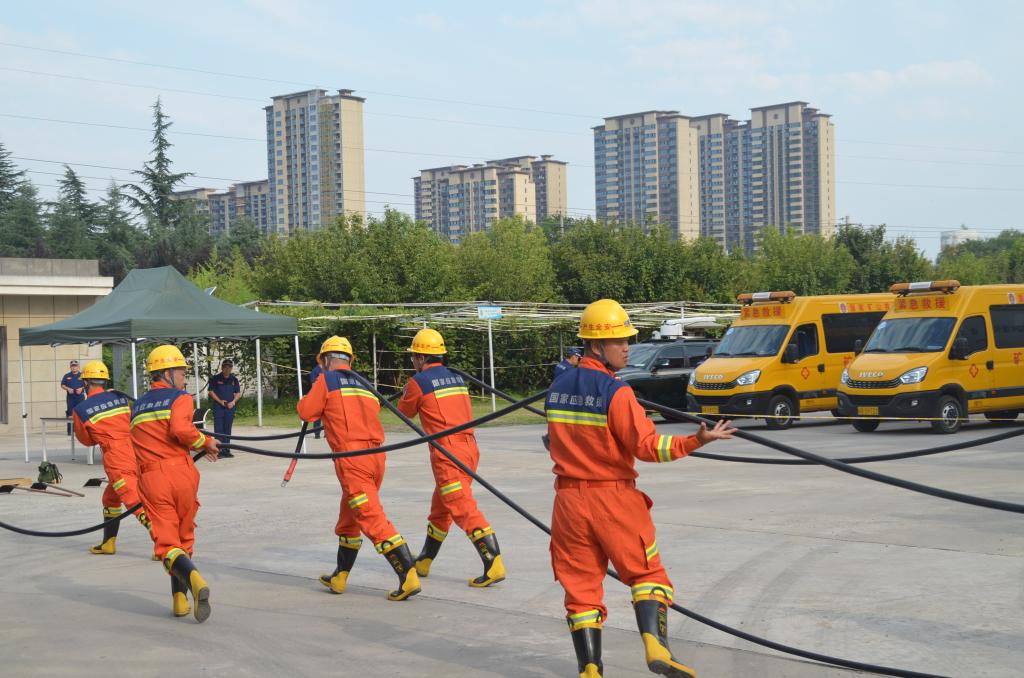 此次演練分為沙袋封堵、現(xiàn)場排水、搜救遇險人員3個場景,聞警出動、布置任務(wù)、鋪設(shè)電纜、安裝水泵、鋪設(shè)水帶、堆積沙袋、現(xiàn)場急救等10余個演練項目相繼開展。到達(dá)演練現(xiàn)場后,指戰(zhàn)員按照救援預(yù)案完成事故現(xiàn)場進(jìn)行探察,迅速展開排水搶險。指揮組、救援組、技術(shù)組、通訊組、警戒組等各救援小組各司其職,相互配合,指戰(zhàn)員利用防汛沙袋迅速構(gòu)筑堅實的防水墻,安裝應(yīng)急排水泵、連接排水管等進(jìn)行排水作業(yè),有效防止雨水倒灌,待蓄水池水位下降后,救援小組立即對遇險人員進(jìn)行搜救并送醫(yī)治療,經(jīng)過40多分鐘的搶險作業(yè),險情得到有效處置,圓滿完成此次防汛搶險演練。