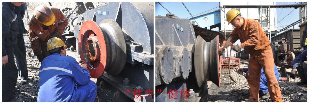 另一路在書記的帶領(lǐng)下,拆卸摩擦輪固定螺絲,不一會發(fā)現(xiàn)了難題,膨脹鋼圈“長”在了鋼軸上無法卸下,見多識廣的書記立刻命令把早準備好的氧焊抬過來,先小心翼翼的加熱,再用鋼釬鑿,隨著一錘錘的敲打時至中午2點,各路干將錯過了飯點略顯疲態(tài),書記道“大家辛苦了,再加把勁,我掏腰包給大家買飯去”。席地而坐飽餐過后,頑固的膨脹圈終于被“拿下”,書記帶人迅速的搭起三腳架飛快的拉起倒鏈將摩擦輪安裝上。一切完工時將至黃昏,一列火車此時正緩緩駛進車站,“鐵牛”掛上了車皮,新的一天繁忙的原煤裝運即將啟幕。