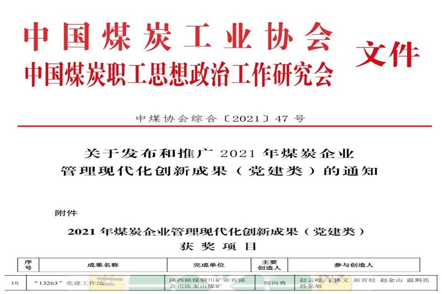 近日,從中國(guó)煤炭工業(yè)協(xié)會(huì)、中國(guó)煤炭職工思想政治工作研究會(huì)獲悉,陳家山礦《“13263”黨建工作法》榮獲2021年煤炭企業(yè)管理現(xiàn)代化創(chuàng)新成果(黨建類)二等獎(jiǎng)。