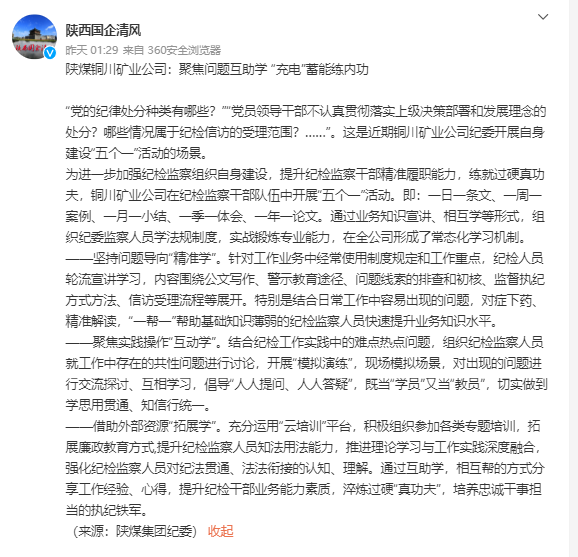為進(jìn)一步加強紀(jì)檢監(jiān)察組織自身建設(shè),提升紀(jì)檢監(jiān)察干部精準(zhǔn)履職能力,練就過硬真功夫,銅川礦業(yè)公司在紀(jì)檢監(jiān)察干部隊伍中開展“五個一”活動。即:一日一條文、一周一案例、一月一小結(jié)、一季一體會、一年一論文。通過業(yè)務(wù)知識宣講、相互學(xué)等形式,組織紀(jì)委監(jiān)察人員學(xué)法規(guī)制度,實戰(zhàn)鍛煉專業(yè)能力,在全公司形成了常態(tài)化學(xué)習(xí)機制。