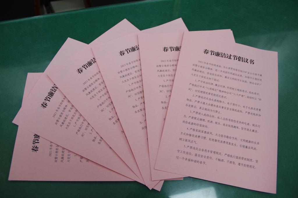 廉潔氛圍更濃厚。該礦紀委組織全礦廣大黨員干部集中傳達學習了習近平總書記在二十屆中央紀委二次全會面從嚴治黨。通過干部工作群、紀委工作群等平臺,分別向全礦每位黨員干部及時推送廉潔過節(jié)提醒短信,發(fā)放《春節(jié)廉潔過節(jié)倡議書》,簽訂《廉潔過節(jié)承諾書》。多措并舉,教育引導黨員干部自覺把紀律和規(guī)矩挺在前面,嚴格家庭家教家風,大力倡導勤儉節(jié)約、文明健康的生活方式,緊繃“廉潔弦”,確保節(jié)日期間風清氣正。